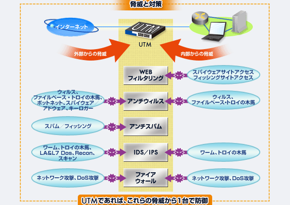 UTMファイアウォールは、複数のセキュリティ技術を一つのデバイスに統合したものであり、パケットフィルタリング、IDS/IPS、アンチウイルス、アンチスパム、VPN、Webフィルタリングなどが含まれます。これにより、LAN内部からの攻撃や外部からの攻撃、またWebサイトへのアクセス制御が可能になります。
